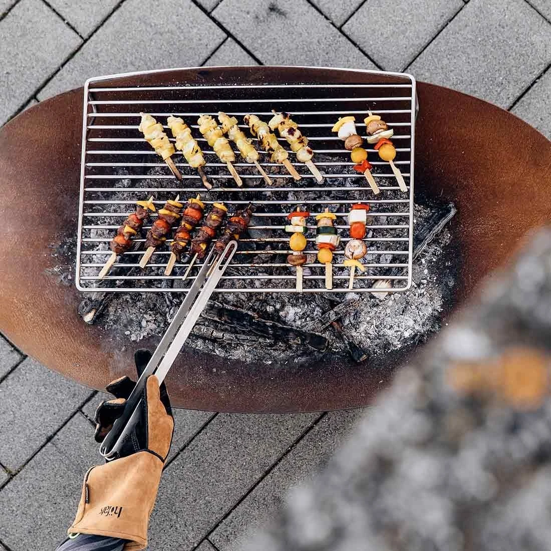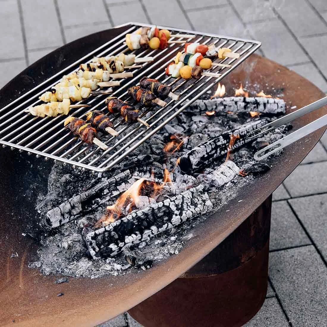 Durch den massiven Edelstahl Grillrost kann mit ELLIPSE auch gegrillt werden. Dabei kann die Hitze erhöht werden indem mehr Glut unter den Grillrost platziert bzw. reduziert indem Glut zur Seite geschoben wird.