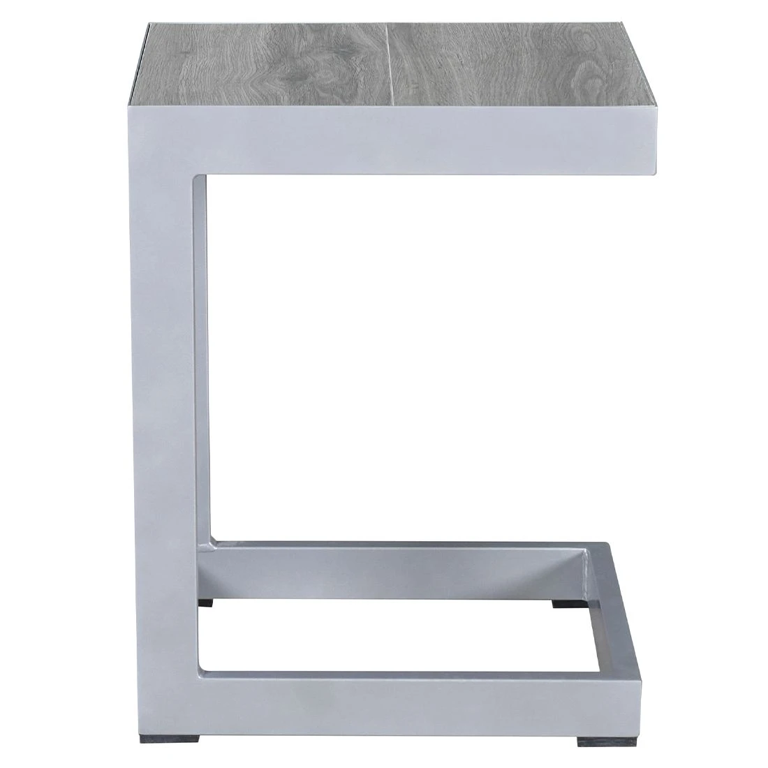Als Material des Gestells dient qualitativ hochwertiges Aluminium. Farblich ist das Gestell in Silber gehalten. Für die Tischplatte wird hochwertiges Keramik verwendet, das im Garten eine angenehme Wohlfühl-Atmosphäre verbreitet. Für ein stimmiges Gesamtbild erscheint die Platte in der Farbe Easy Grey. Das Gestell besticht mit seinen attraktiven Kufen. Mit der rechteckigen Form lässt sich der Beistelltisch platzsparend in Ecken oder an Häuserwänden aufstellen.
