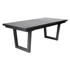 Das Gestell des eleganten Tisches besteht aus Aluminium. Der moderne Look des Ausziehtisches wird durch die attraktiven Kufen nochmals betont. Für die Tischplatte wird das Naturmaterial Keramik verarbeitet. Keramikplatten sind stoß-, schlag- und schnittbeständig und zählen somit zu den stabilsten Tischplatten auf dem Gartentisch-Markt. Farblich ist die Tischplatte in einem schönen Holzoptik Dunkelgrau gehalten. Mit der rechteckigen Form lässt sich der Ausziehtisch platzsparend in Ecken oder an Häuserwänden aufstellen.