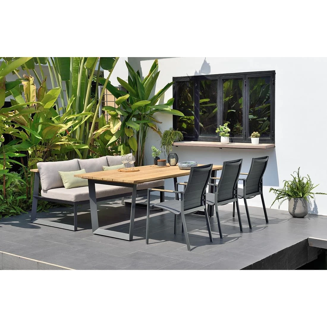 Das Gestell des tragbaren Tisches besteht aus Aluminium. Der moderne Look des Gartentisches wird durch die attraktiven Kufen nochmals betont. Als Material für die Tischplatte wird das besonders hochwertige Hartholz Teak verwendet. Die Maserung dieses Holzes und der angenehme Farbton integrieren sich sehr gut in jegliche Arten der Garten- und Balkongestaltung und bescheren eine einzigartig natürliche Atmosphäre. Farblich ist die Platte in Teak Natur gehalten. Der Gartentisch ist klassisch rechteckig gestaltet.