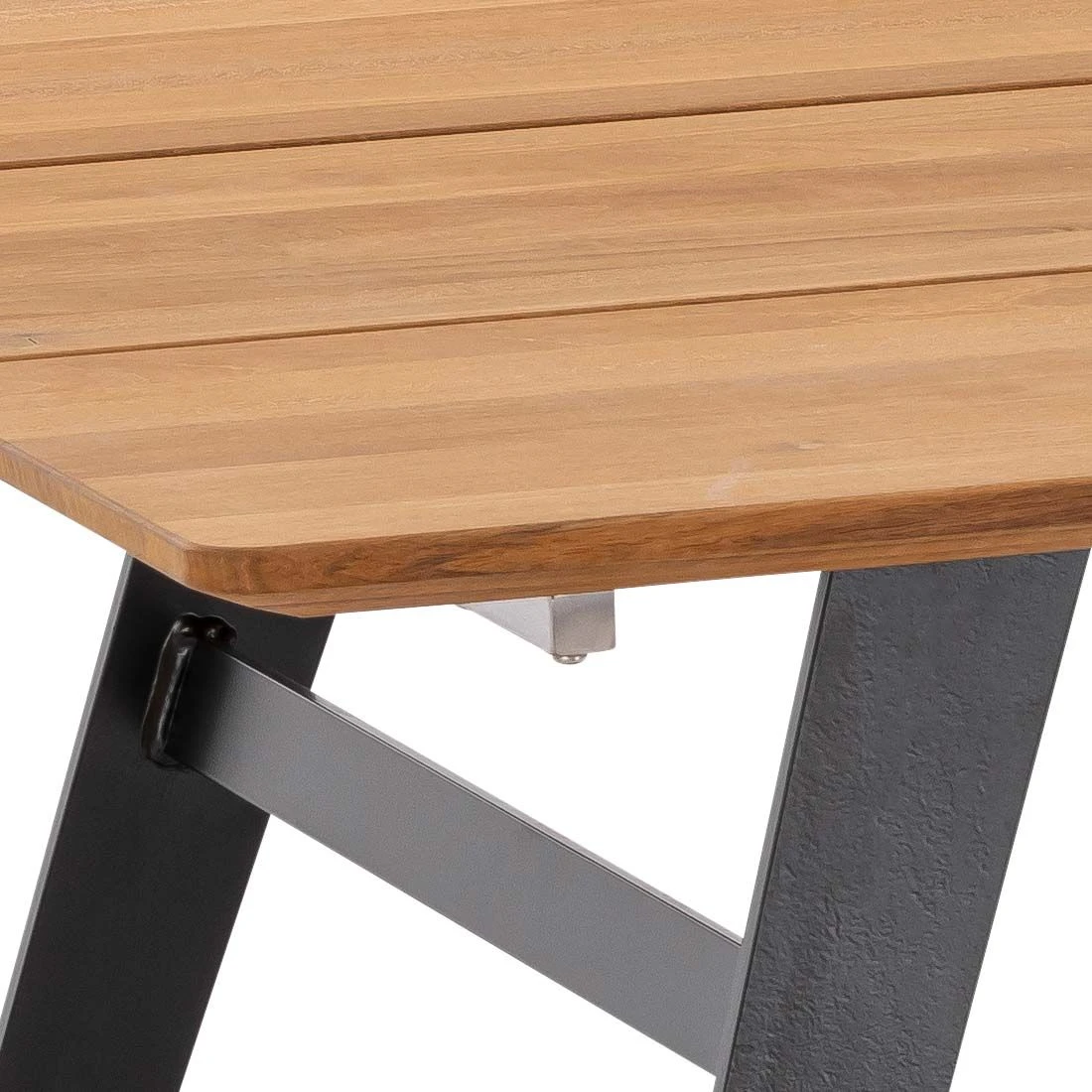 Das robuste Gestell-Material des Gartentisches besteht aus Stahl. Als klassische Design-Komponente fungiert das geradlinige Vierfußgestell. Als Material für die Tischplatte wird das wertige Hartholz Teak verwendet. Die Maserung dieses Holzes und der warme Farbton integrieren sich sehr schön in jegliche Arten der Garten- und Balkongestaltung und sorgen für eine einzigartig natürliche Atmosphäre. Farblich ist die Tischplatte in einem schönen Natur gehalten. Mit der rechteckigen Form lässt sich der Gartentisch platzsparend in Ecken oder an Häuserwänden aufstellen.