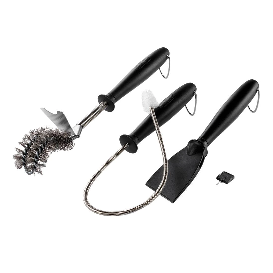Dreiteiliges Napoleon® Reinigungsset, bestehend aus: Tube Cleaner zum Reinigen des Brenners von innen – bei Ablagerungen oder Spinnenbefall (67 cm x 2,9 cm). Brenner-Bürste für die Außenreinigung der Brenner. Mit stabilen Edelstahlborsten und rund geformtem Schaber für eine gründliche Reinigung (38 cm x 6 cm x 6,9cm). Schaber für die Grillkammer aus Kunststoff mit herausnehmbarem Dorn für die Brennerdüse (29,5 cm x 7 cm x 3,2 cm).