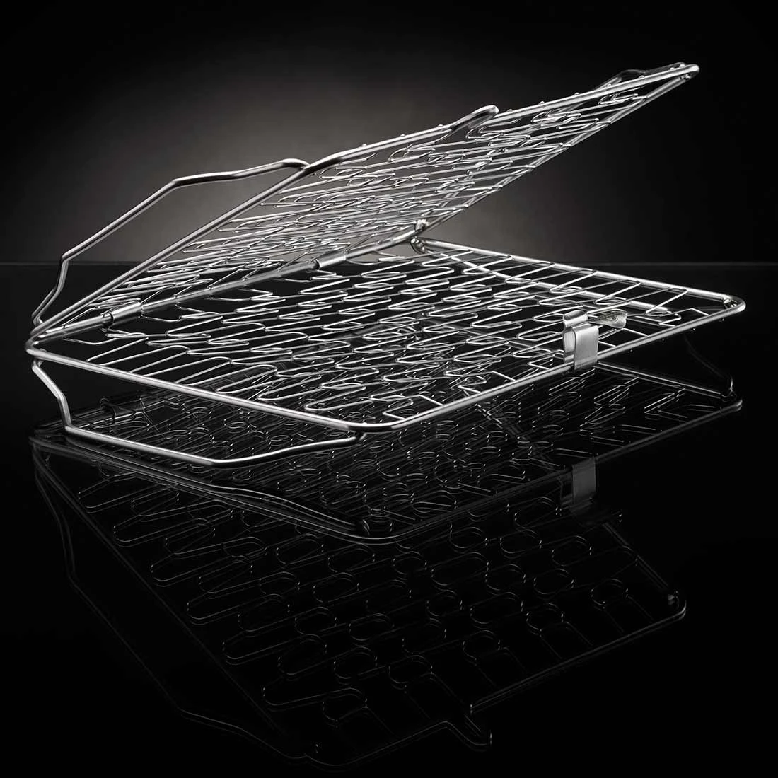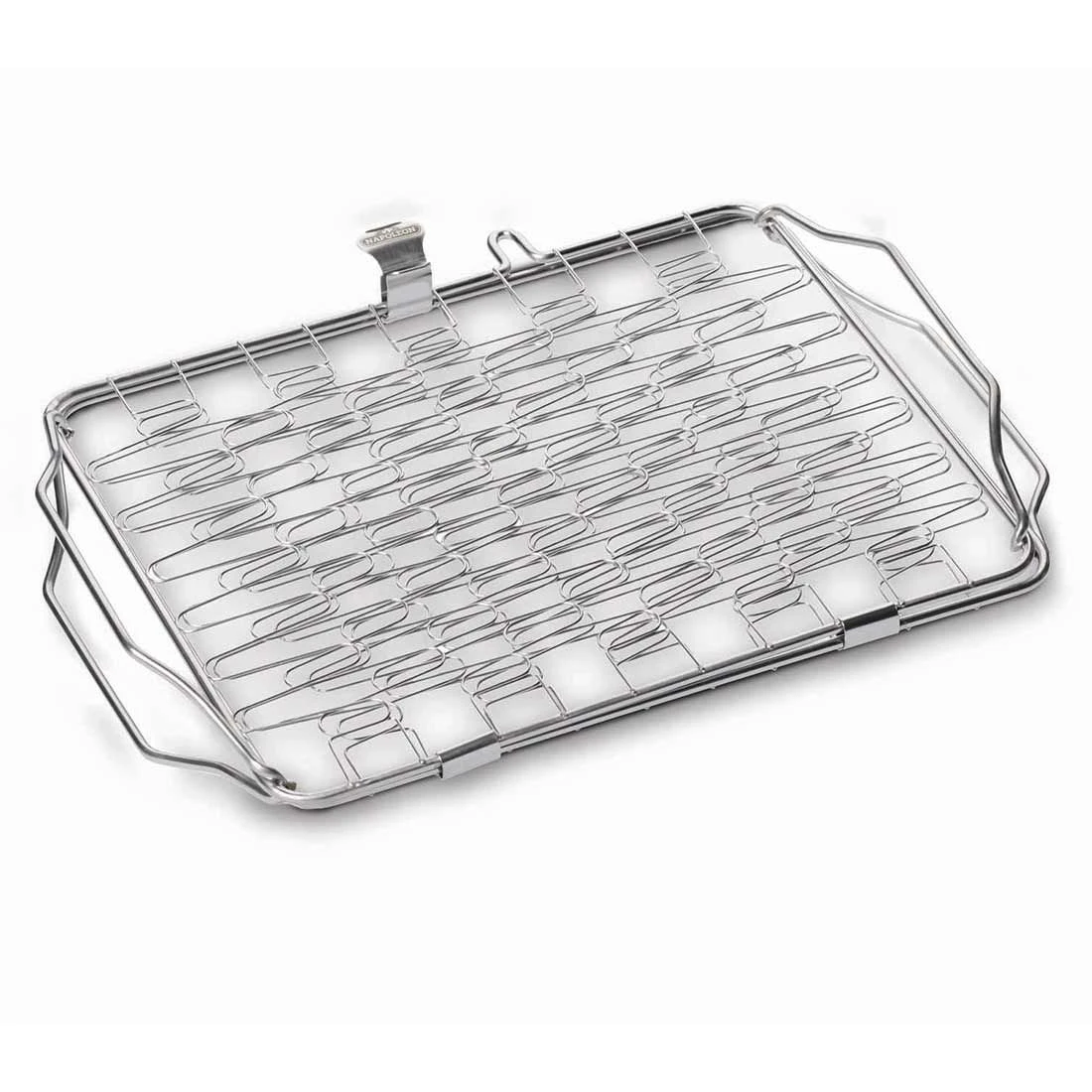 Napoleon® Halter mit flexibler Federmechanik für Elastizität. Hält Speisen zwischen den zwei Seiten fest und ist exzellent für die Zubereitung von Lachs, Gemüse etc. geeignet. Aufgrund der Bügel an beiden Seiten ist indirektes Grillen möglich. Spülmaschinenfest. Passend für fast alle Grillmodelle (40,1 cm x 26,2 cm x 8,6 cm).