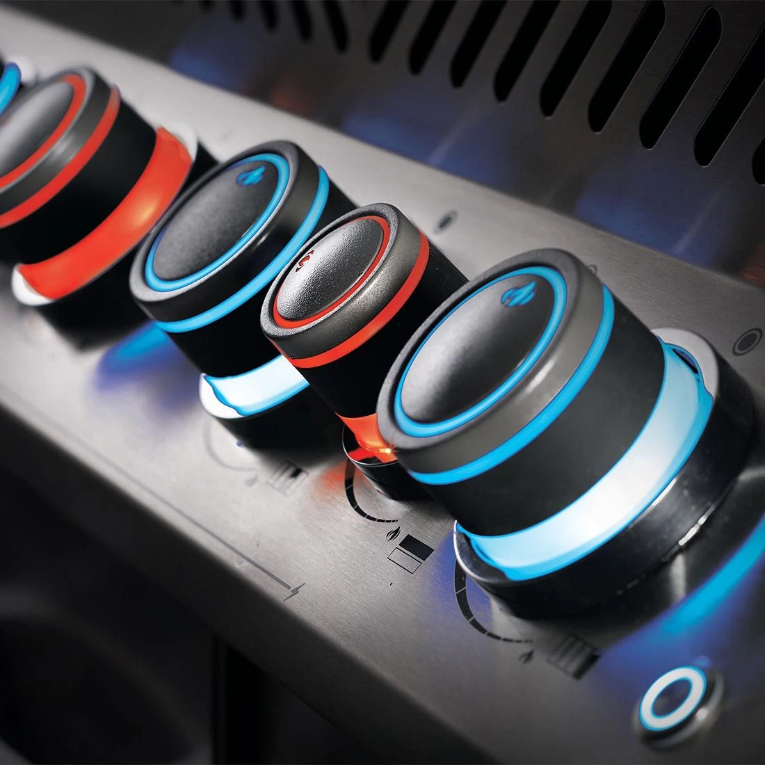 Die ergonomischen SAFETY GLOW™ Drehregler besitzen eine angenehme Haptik und sorgen für eine präzise Temperatursteuerung, diese verfügen zudem eine blaue Hintergrundbeleuchtung, welche bei strömendem Gas seine Farbe auf Rot ändert. Das Napoleon®-typische Wellen-Design der WAVE™ Grillroste sorgt für eine gleichmäßigere Hitzeverteilung und hält auch kleineres Grillgut sicher am Rost.