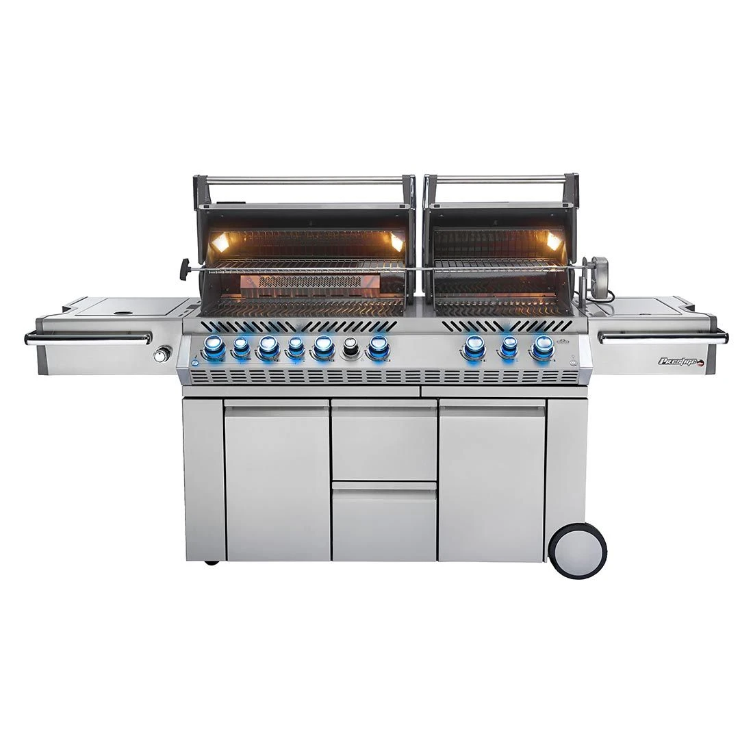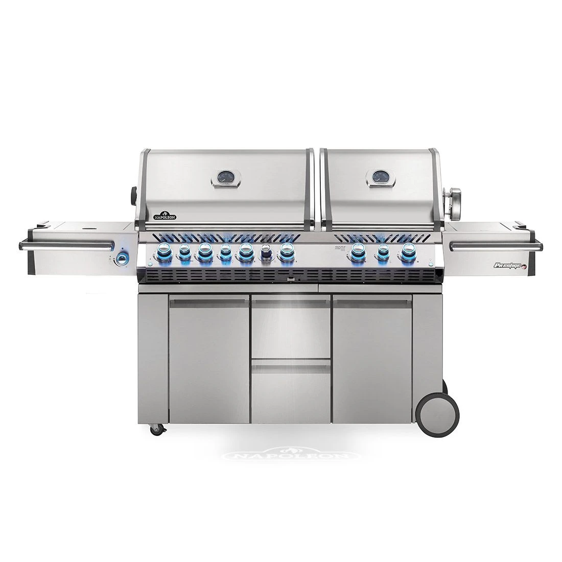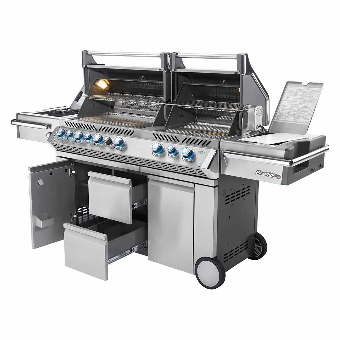 Mit zwei Grillhauben, zwei SIZZLE ZONE™ Brennern, einem Infrarot-Heckbrenner und dem POWER-Seitenbrenner stellt der Prestige PRO™ 825 seine Kollegen beinahe in den Schatten. Denn dieser Grill setzt definitiv neue Maßstäbe in Sachen Grillen: Die gesamte Konstruktion ist aus hochwertigem Edelstahl gefertigt, wobei die Chrom-Akzente entlang der Seitenablagen sowie das stylische Bedienpanel mit SAFETY GLOW™ Drehreglern gleich ins Auge stechen. Die größere der beiden Grillflächen wartet mit vier unteren Edelstahl-Brennern, einem Infrarot-Heckbrenner für Drehspieß-Gerichte (Drehspieß im Lieferumfang enthalten) und einem speziellen Räuchereinsatz mit eigenem Brenner auf Sie. Damit verwandeln Sie Ihren Gasgrill im Handumdrehen in einen Smoker. Gleich daneben befindet sich der „Steak-Himmel“. Denn unter der zweiten Grillhaube befinden sich zwei Infrarot SIZZLE ZONE™ Brenner mit extrem hohen Temperaturen zum scharfen Anbraten von Steaks sowie ein dazwischenliegender Edelstahl-Rohrbrenner zur gleichmäßigen Hitzeverteilung und zum Warmhalten von Speisen. Dieses duale Haubensystem erlaubt es, völlig unterschiedliche Speisen gleichzeitig zu grillen. Beide Grillhauben sind dank des LIFT EASE™ Designs besonders leichtgängig und platzsparend, sodass Sie diesen Mega-Grill auch dicht an eine Mauer oder Hauswand stellen können (berücksichtigen Sie dabei die jeweils geltenden Sicherheitsvorschriften). Neben diesen beiden Grillflächen wartet noch der seitliche, ringförmige Power-Brenner auf seinen Einsatz. Der runde Keramik-Infrarotbrenner ist von einem Brenner umgeben, der einzeln als Seitenbrenner zum Wärmen und Warmhalten dient. Während der POWER-Seitenbrenner einen Gusseisen-Grillrost besitzt, sorgen unter den beiden Grillhauben WAVE™ Stabgrillroste aus 9,5 mm dickem Edelstahl für eine gleichmäßige Hitzeverteilung und das Napoleon-typische Branding. Flammenschutzeinsätze aus Edelstahl bilden eine extra Oberfläche und werden so zu Aromaschienen, die dem Grillgut eine besonders aromatische Grillnote verleihen. Diese Aromaschienen sind dank des geradlinigen und durchdachten Designs besonders einfach zu reinigen. Auch die beiden großen, von vorne ausziehbaren Fettauffangschalen erleichtern die Reinigung. Sollte das Grillvergnügen mal etwas länger dauern, sorgen die SAFETY GLOW™ Drehregler, die sich von blauem auf rotes Licht ändern, wenn Gas strömt, sowie eine integrierte Halogen-Innenbeleuchtung für helle Freude. Im Lieferumfang enthalten sind nebst allen oben genannten Teilen und Funktionen außerdem zwei Warmhalteroste, die auf Länge der Grillflächen fertig gegrillte Speisen warm hält. Außerdem gehört ein Drehspieß zum Lieferumfang dazu.