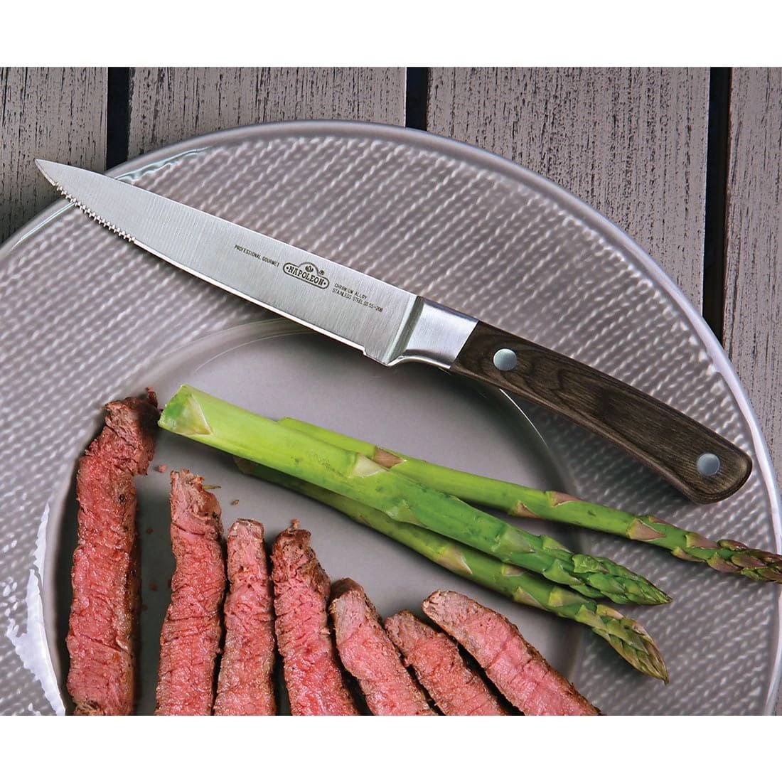 Das Napoleon® Steakmesser mit genietetem Rosenholzgriff gleitet mit seiner 12,7cm langen Klinge mühelos durch dicke Steaks. Das Messer ist robust geschmiedet sowie ideal ausbalanciert und besticht durch sein klares Design.