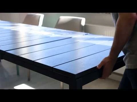 Das Gestell des eleganten Tisches besteht aus Aluminium. Als Material für die Tischplatte wird hochwertiger und leicht zu reinigender Kunststoff verwendet. Farblich sind Gestell und Tischplatte einheitlich gestaltet und begeistern in Anthrazit. Klassisch aus vier Tischbeinen besteht das Gestell des Tisches. Die rechteckige Form ermöglicht es Ihnen, den Ausziehtisch in Ecken und an Häuserwänden platzsparend einzusetzen.