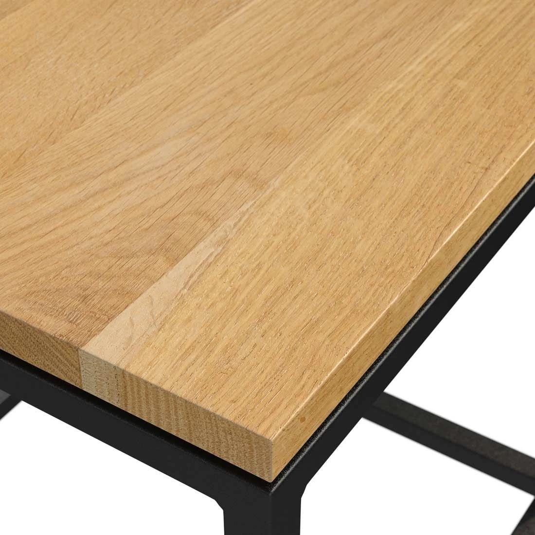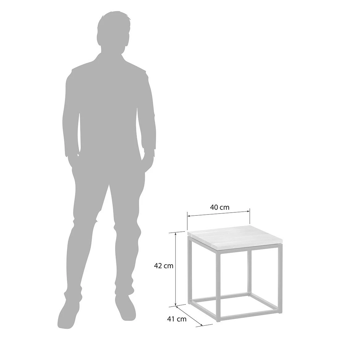 Als Gestellmaterial wird robuster Stahl verwendet. Die Tischplatte ist aus Wildeiche gefertigt und dadurch für den Einsatz auf der Terrasse, im Garten und auf dem Balkon geeignet. Farblich ist die Tischplatte in einem schönen Natur gehalten. Die Form des Beistelltischs ist kompakt quadratisch gehalten.