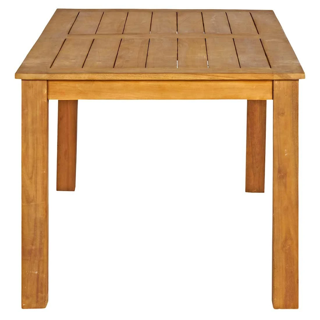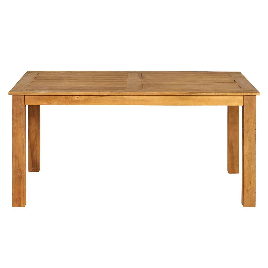 Als klassische Design-Komponente fungiert das geradlinige Vierfußgestell. Sowohl die Tischplatte als auch das Gestell sind aus Teakholz gefertigt. Für ein elegantes Gesamtbild erscheint die Platte in der Farbe Natur. Mit der rechteckigen Form lässt sich der Gartentisch platzsparend in Ecken oder an Häuserwänden aufstellen.