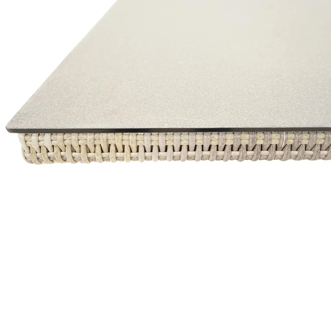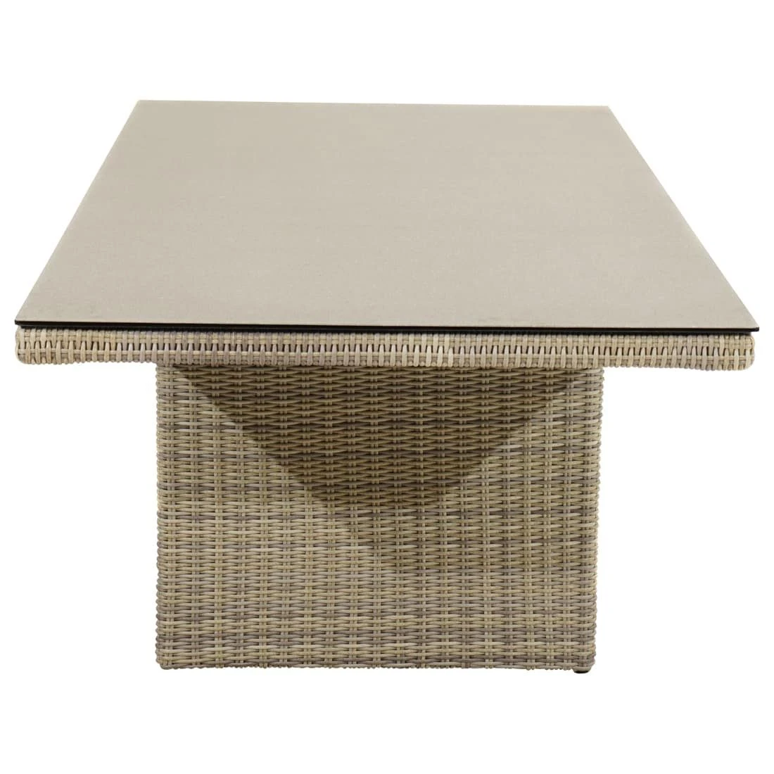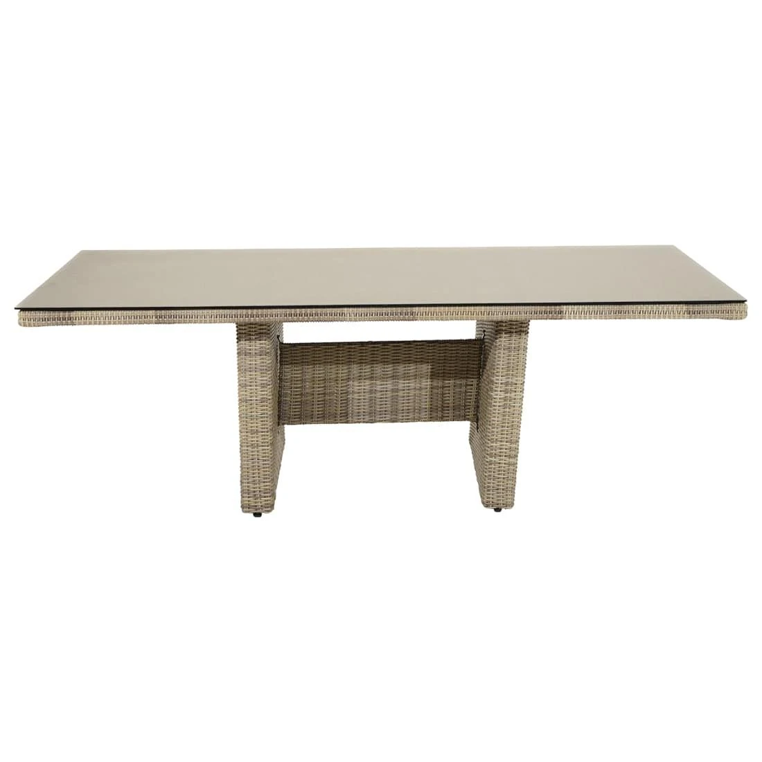 Das Gestell des eleganten Tisches ist aus Aluminium gefertigt. Farblich ist das Gestell in Beige gehalten. Für die Herstellung der Tischplatte wird robustes Glas verwendet. Farblich ist die Tischplatte in einem schönen Grau gehalten. Die Geradlinigkeit des Designs wird durch das Gestell in Wangenform betont. Der Gartentisch ist klassisch rechteckig gestaltet.