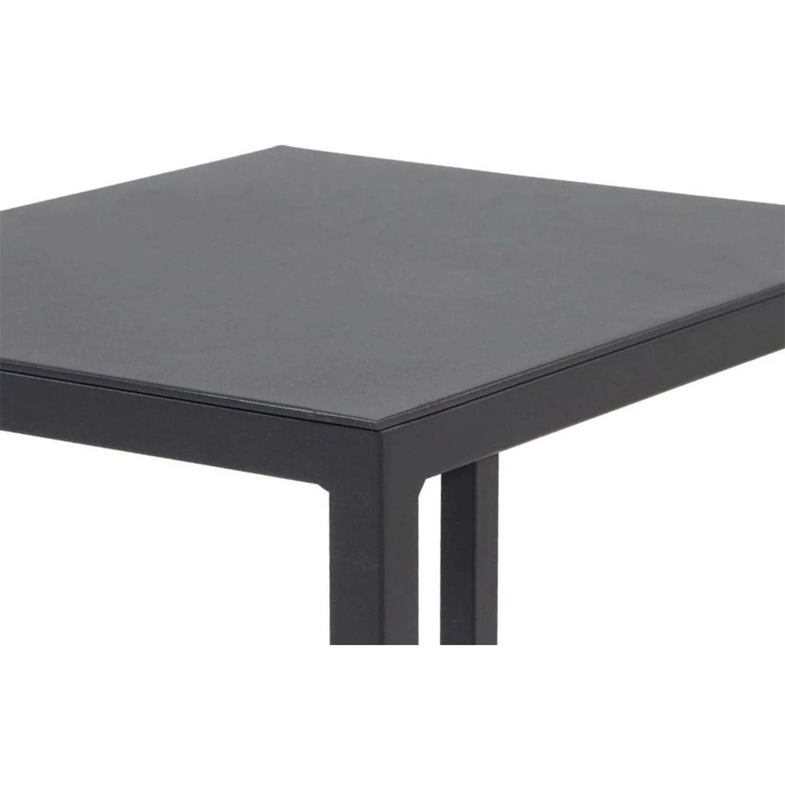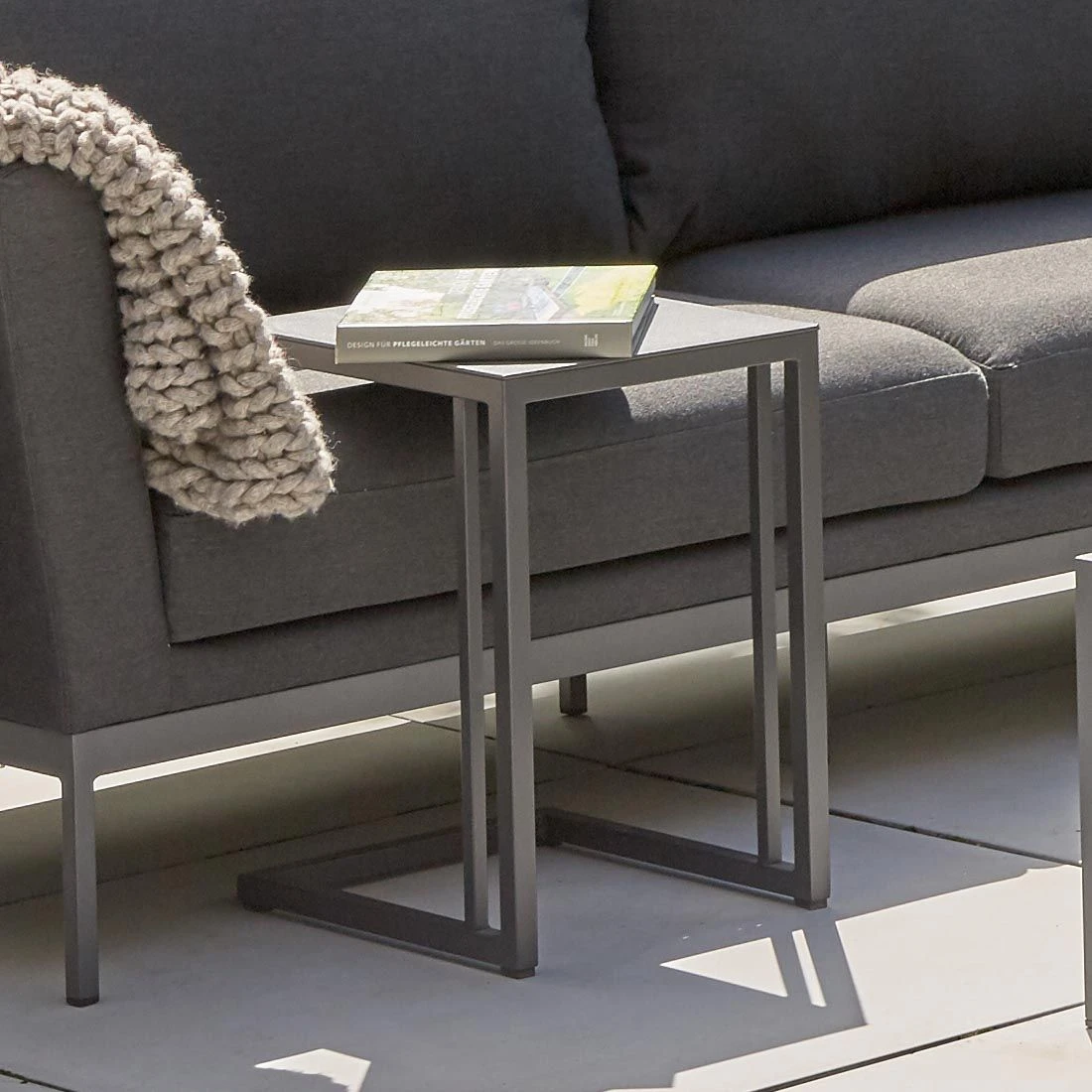 Der Beistelltisch ist komplett aus Aluminium gefertigt und gibt so ein charmantes, einheitliches Bild auf der Terrasse ab. Farblich sind Gestell und Tischplatte einheitlich gestaltet und begeistern in Anthrazit. Das robuste Kufengestell lässt sich hervorragend mit modernen Freischwingern und anderen Kufenmöbeln kombinieren. Die Form des Beistelltischs ist klassisch rechteckig gehalten.
