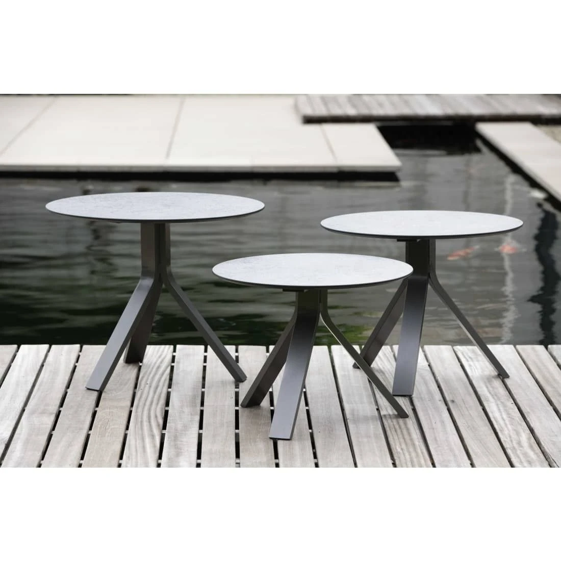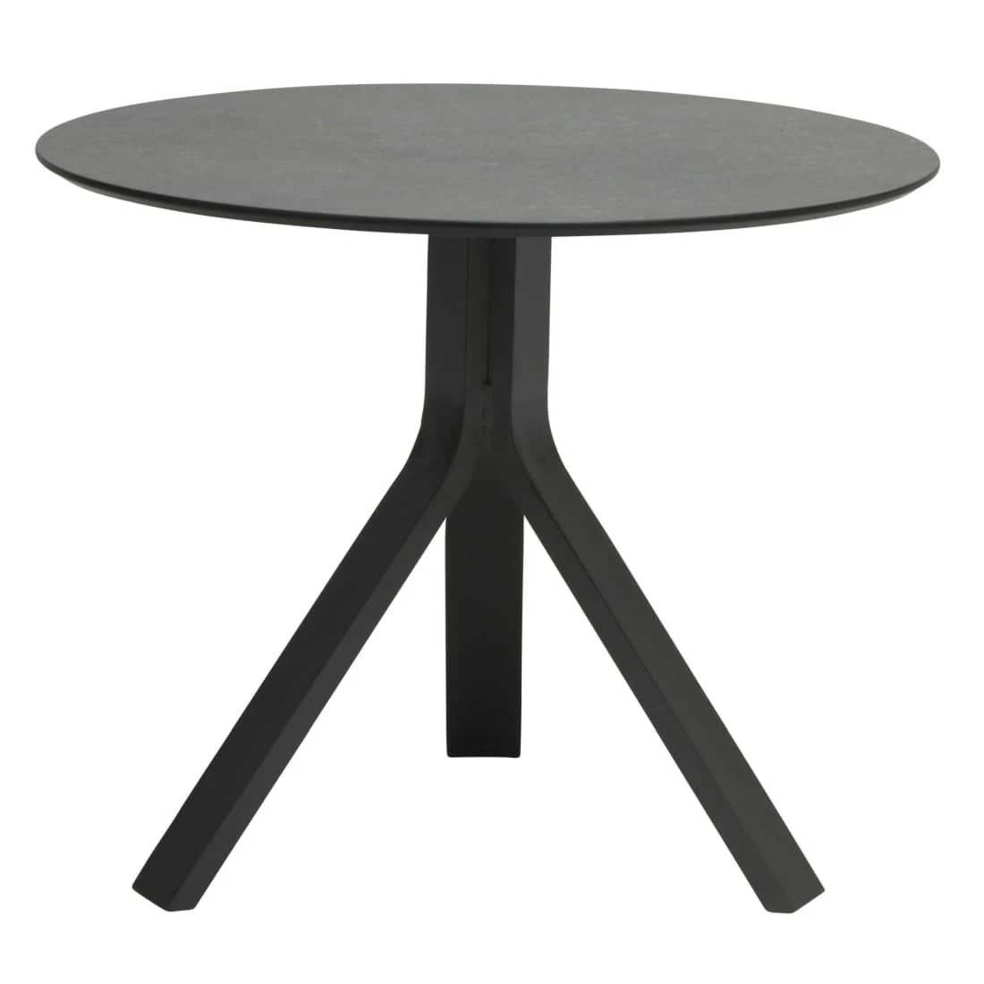 Das Gestell des attraktiven Tisches ist aus Aluminium hergestellt. Das Tischgestell in Dreibeinform ist äußerst vielseitig einsetzbar und passt zu vielen Einrichtungsstilen. Ob modern oder klassisch – ein Tisch mit Dreibeingestell fügt sich nahtlos in nahezu jedes Ambiente ein. Die langlebige Tischplatte besteht aus Silverstar. Dieses Material wird aus bis zu 50 Lagen Papierlaminatschichten gefertigt, die unter großer Hitze und hohem Druck verpresst werden. Diese Technik verleiht der Tischplatte ganz besondere Eigenschaften, denn sie ist kratzfest, kälte- (-20 °C) und hitzebeständig (180 °C), UV-beständig, pflegeleicht und abriebfest. Unabhängig von der Vielzahl an Dekoren ist der Kern immer schwarz, was man an der Kante der Platte erkennen kann. Farblich ist die Tischplatte in einem schönen Smoky gehalten. Der Beistelltisch ist in seinem Design klassisch rund gefertigt.