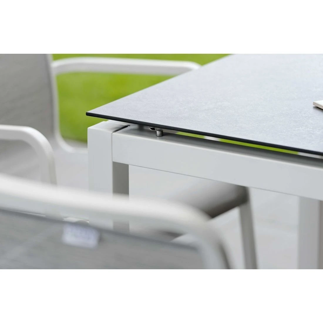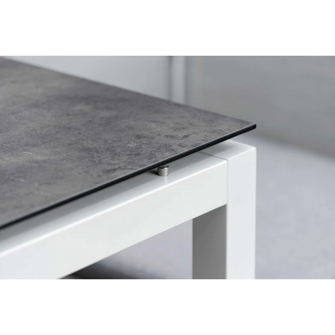 Das Gestell des attraktiven Tisches besteht aus Aluminium. Optisch ist das Gestell in Weiß gehalten.