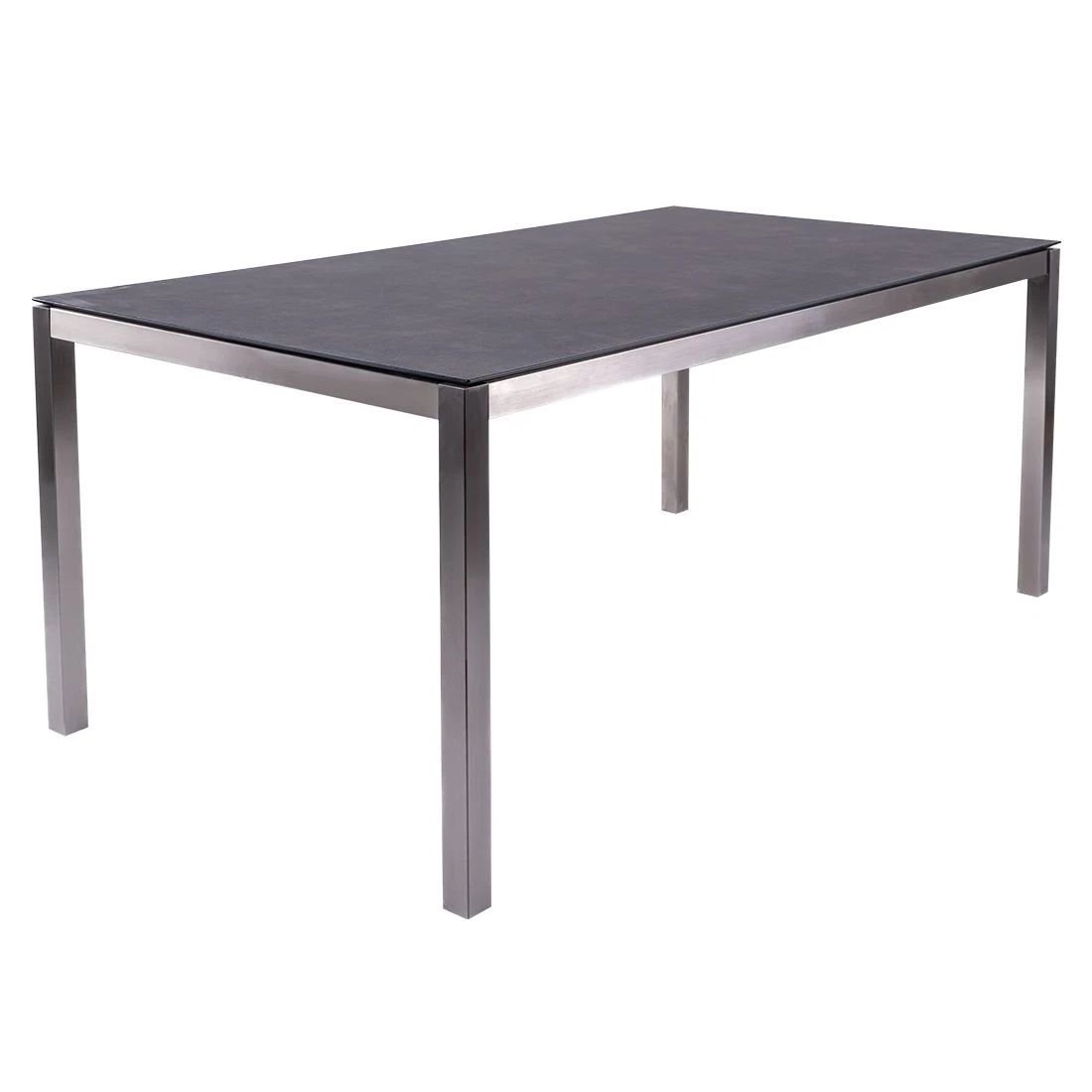 Das Gestell ist aus rostfreiem und pflegeleichtem Edelstahl gefertigt und sehr windsicher auf der Terrasse und im Garten. Farblich ist das Gestell in Silber gehalten. Die schöne HPL-Tischplatte ist nicht nur ein optischer Hingucker, sondern besitzt auch eine außerordentlich robuste und unbedingt kratzfeste Oberfläche, die sämtlichen Belastungen entgegenwirkt. Farblich ist die Platte in Volcanic Stone gehalten. Klassisch aus vier Tischbeinen besteht das Gestell des Tisches. Mit der rechteckigen Form lässt sich der Gartentisch platzsparend in Ecken oder an Häuserwänden aufstellen.